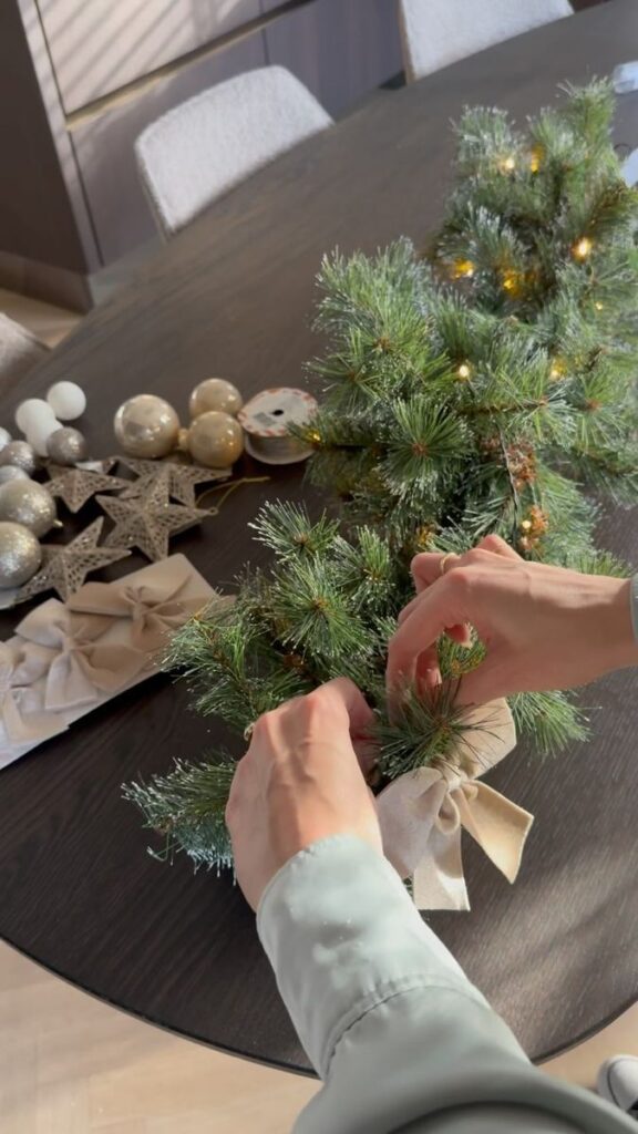 Zatim je ravnomjerno omotajte nježnim lampicama. Slijedi ukrašavanje – koristite iste ili slične ukrase kao na vijencu ili božićnom drvcu. Tako će cijeli prostor djelovati skladno i promišljeno.