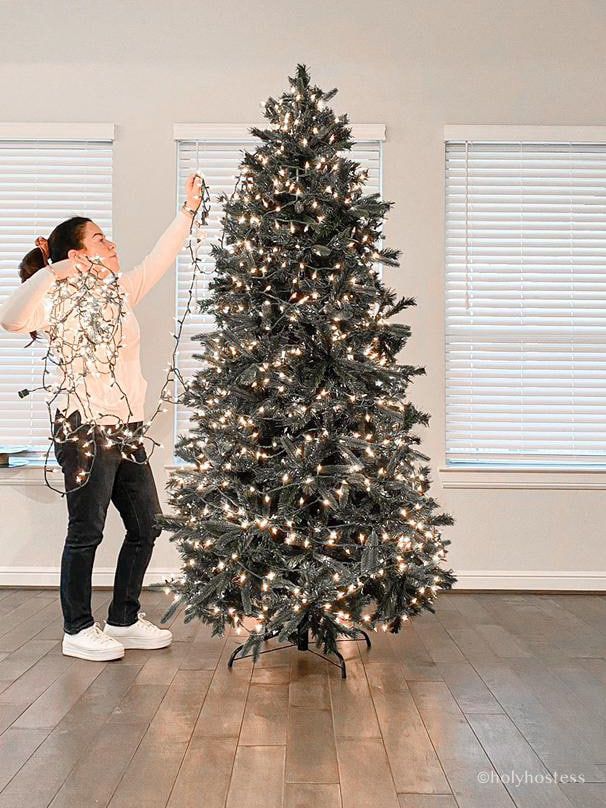 Možete početi odozdo prema gore ili obrnuto. Važno je provlačiti lampice među granama, a ne samo uz rubove – tako drvce dobiva bogatiji svjetlosni efekt.