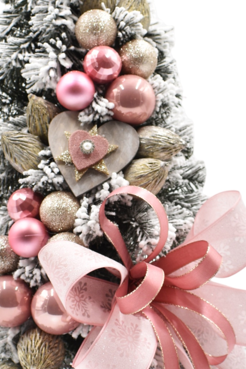 Drvce ima božićne ukrase u ružičastoj boji, dopunjene nekoliko drvenih i krem ukrasa. Njegove dominantne karakteristike su ružičaste božićne kuglice, krem ukrasi i masivna ružičasta mašna.
