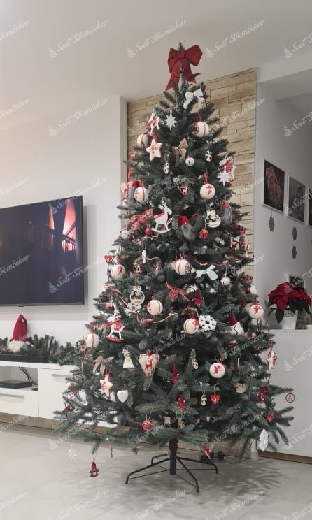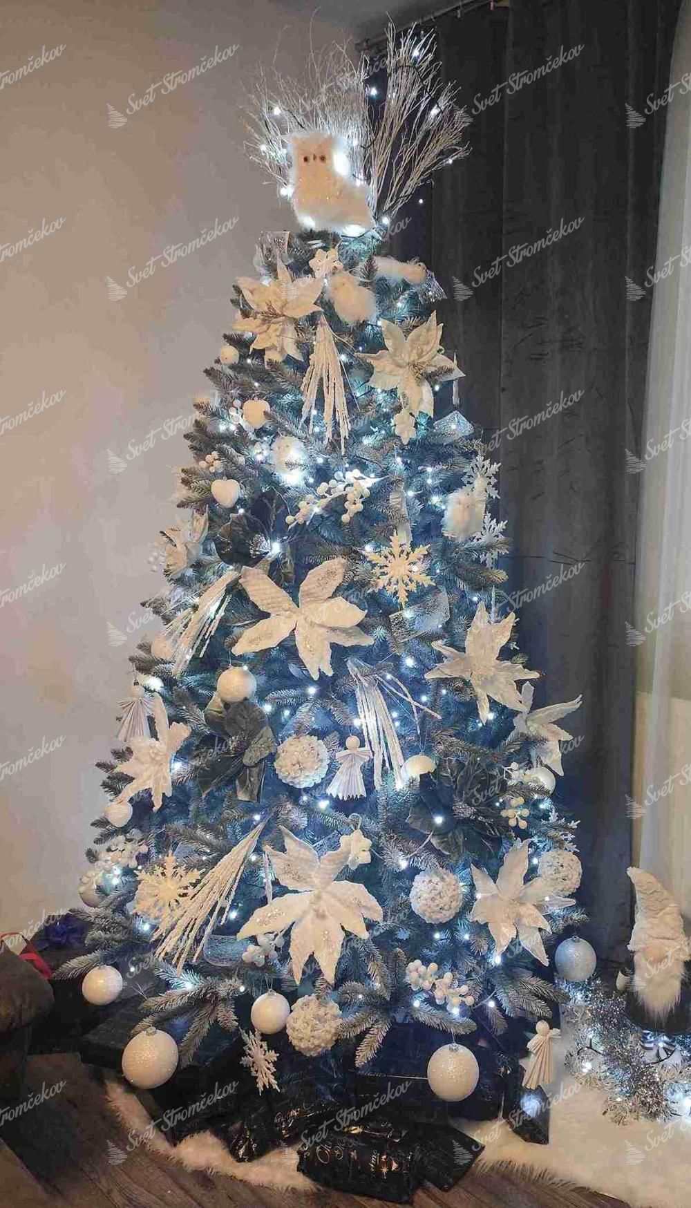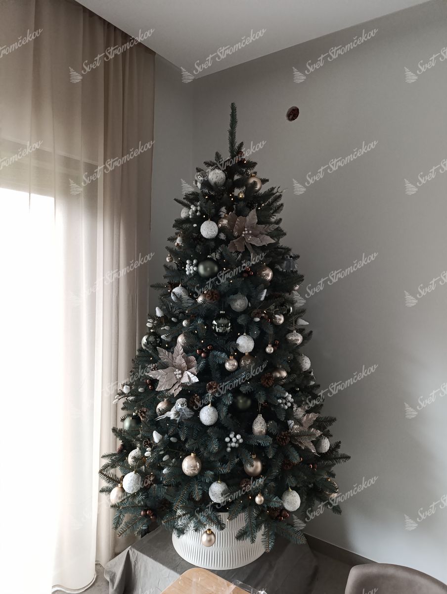 Umjetno božićno drvce srebrna smreka karakteriziraju ga složene uske PVC iglice tirkizno-srebrne boje i velik broj grančica. Kvalitetna željezna konstrukcija i stabilno postolje dio su paketa.